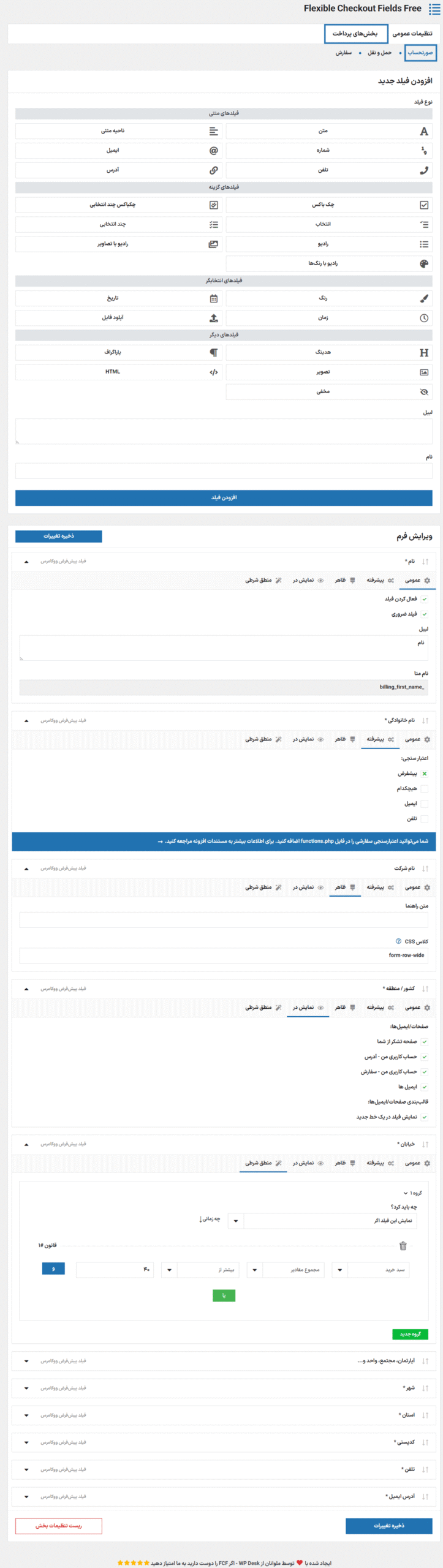- مرحله ۵: از بخشهای سفارشی صفحه پرداخت ووکامرس، فیلدهای پرداخت بیشتر، منطق شرطی، قیمتگذاری هر فیلد و گزینههای اضافی در نسخه حرفهای استفاده کنید.