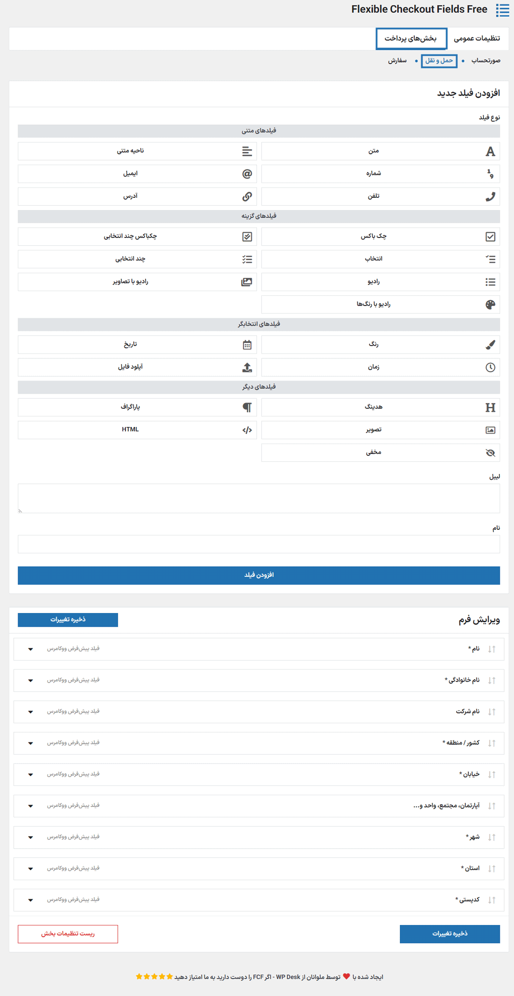 فیلدهای پرداخت انعطافپذیر برای ووکامرس رایگان به شما امکان میدهد بخشهای صورتحساب، ارسال و سفارش را سفارشی کنید 🪟.
