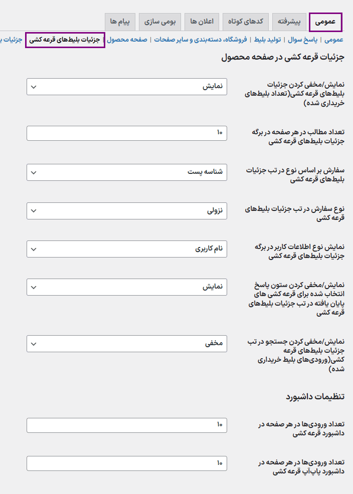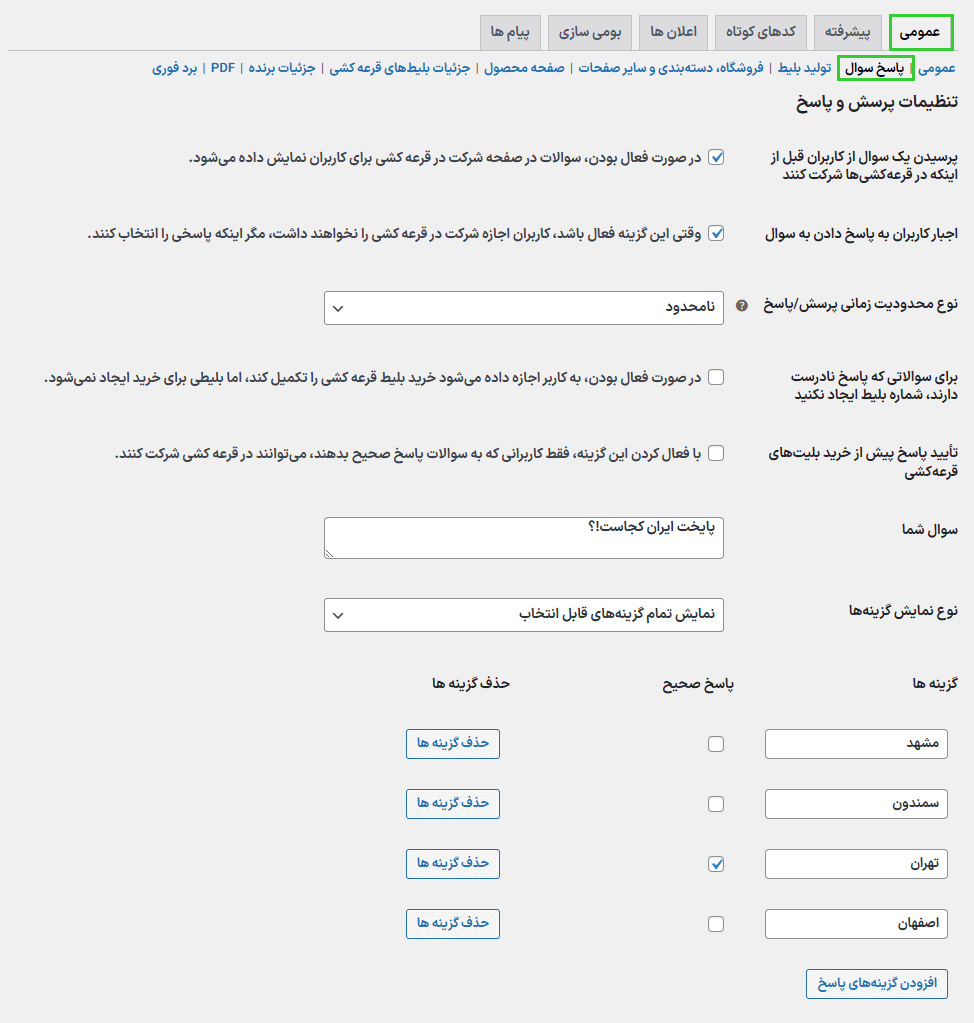 داشبورد قرعه کشی در افزونه قرعه کشی(لاتاری) برای ووکامرس - قبل از خرید بلیط قرعهکشی به یک سوال پاسخ دهید