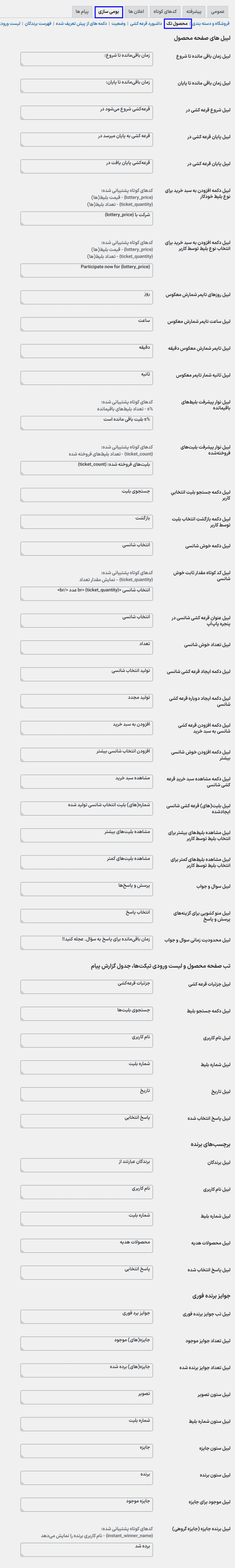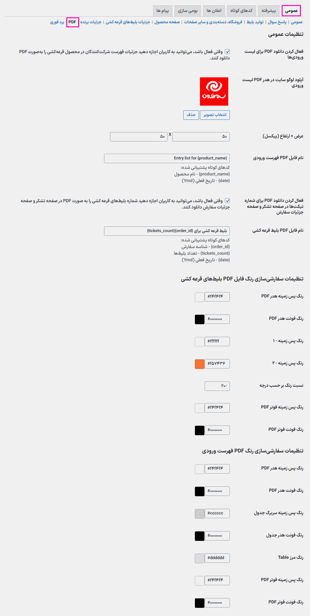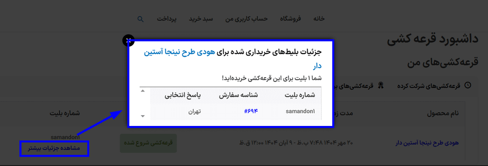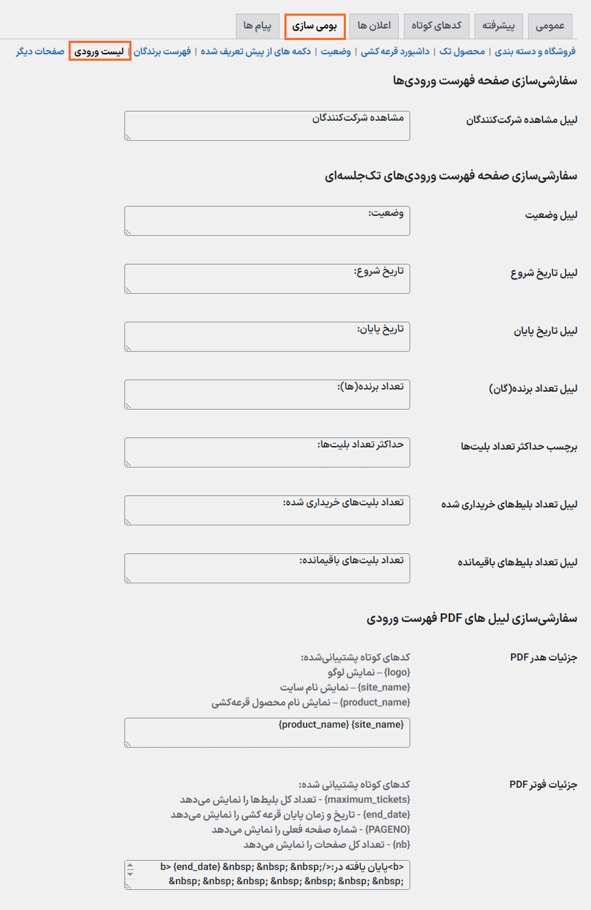 مشتریان میتوانند شماره بلیط قرعهکشی را به صورت PDF در صفحه تشکر، صفحه جزئیات سفارش و ایمیل تأیید بلیط قرعهکشی دانلود کنند. مدیر همچنین میتواند بلیط PDF را در ایمیل تأیید بلیط قرعهکشی مدیر دانلود کند. - فهرست ورودیهای قرعهکشی