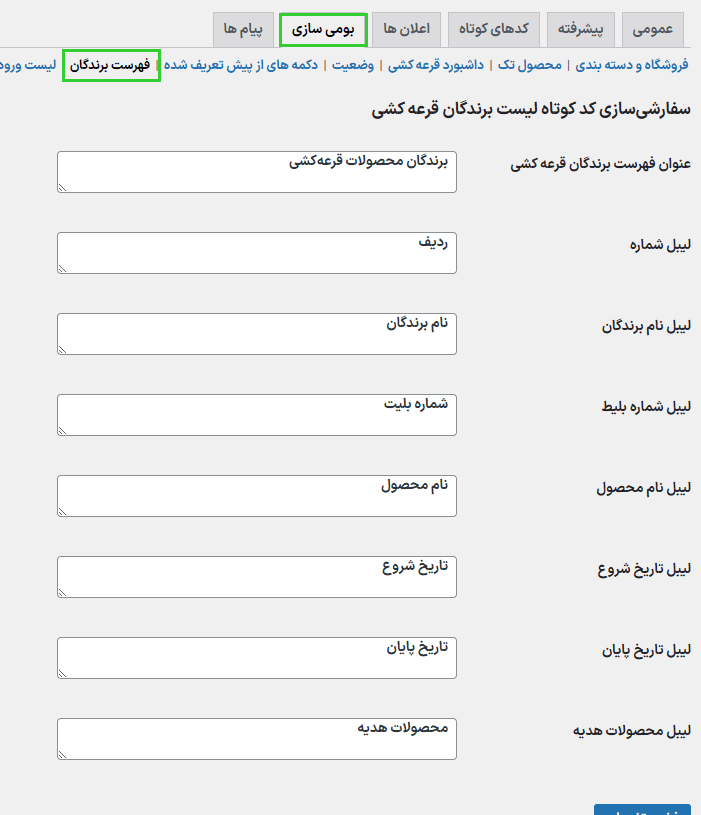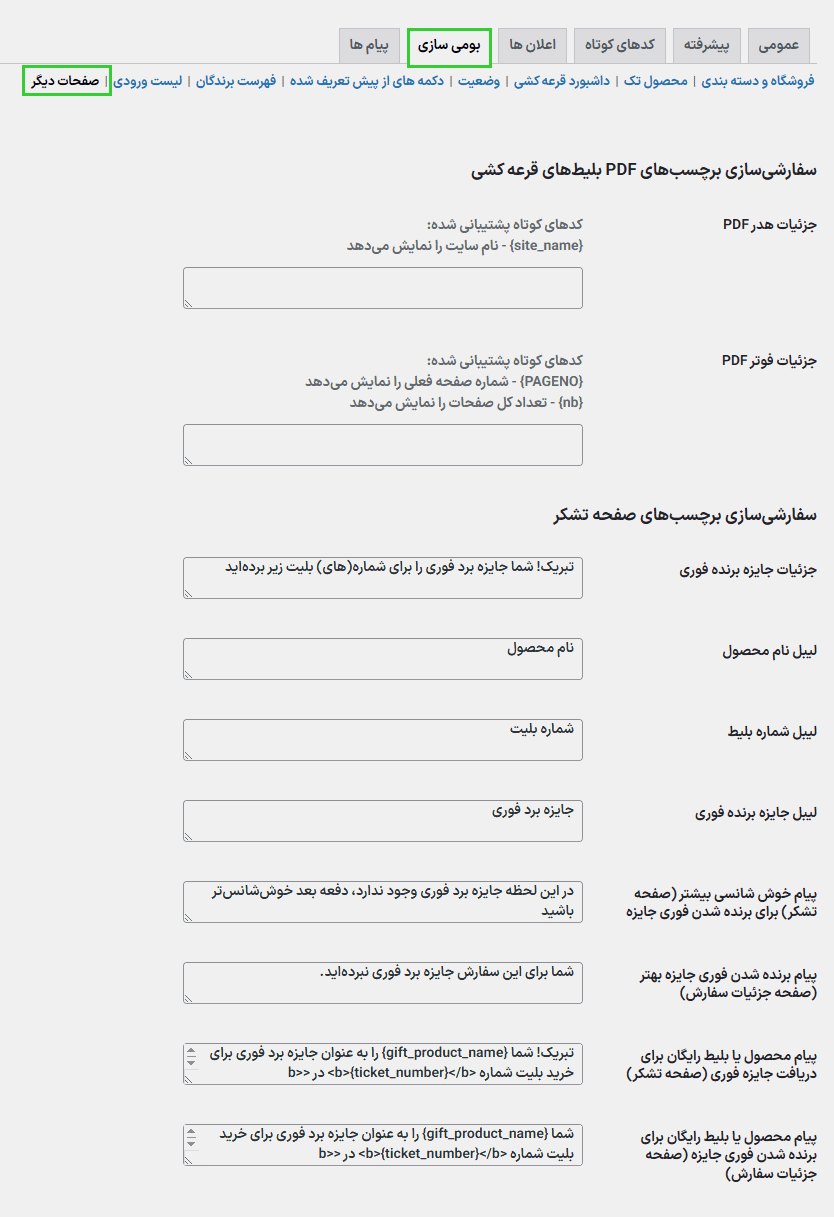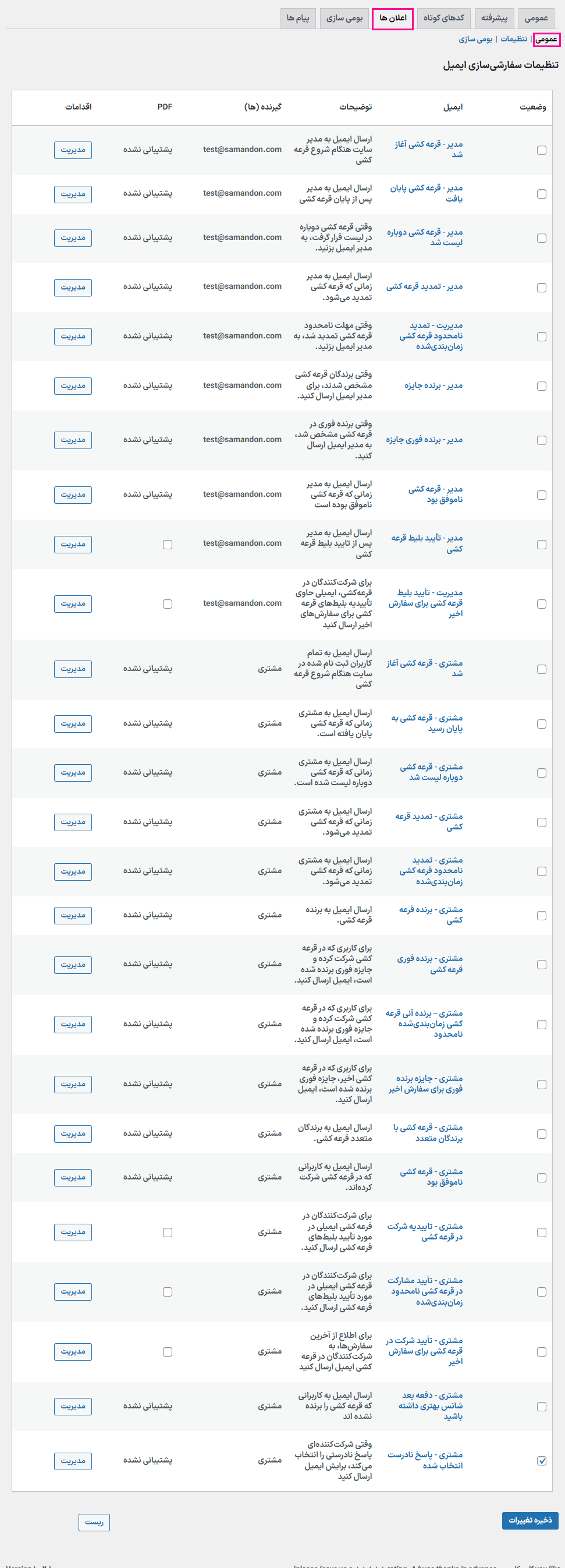 مشتریان میتوانند شماره بلیط قرعهکشی را به صورت PDF در صفحه تشکر، صفحه جزئیات سفارش و ایمیل تأیید بلیط قرعهکشی دانلود کنند. مدیر همچنین میتواند بلیط PDF را در ایمیل تأیید بلیط قرعهکشی مدیر دانلود کند. - فهرست ورودیهای قرعهکشی
