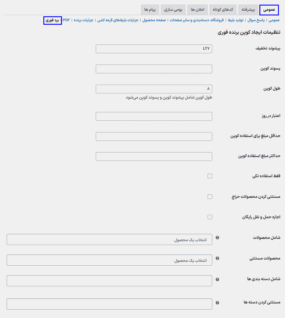 - (v) گزینه اختصاص کوپن WooCommerce برای جایزه برنده فوری