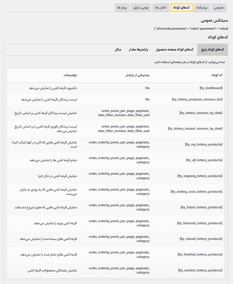 - پارامترهای URL برای داشبورد قرعهکشی.