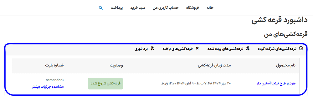 قرعه کشی ها در افزونه قرعه کشی(لاتاری) برای ووکامرس - داشبورد برای مشتری و مدیر