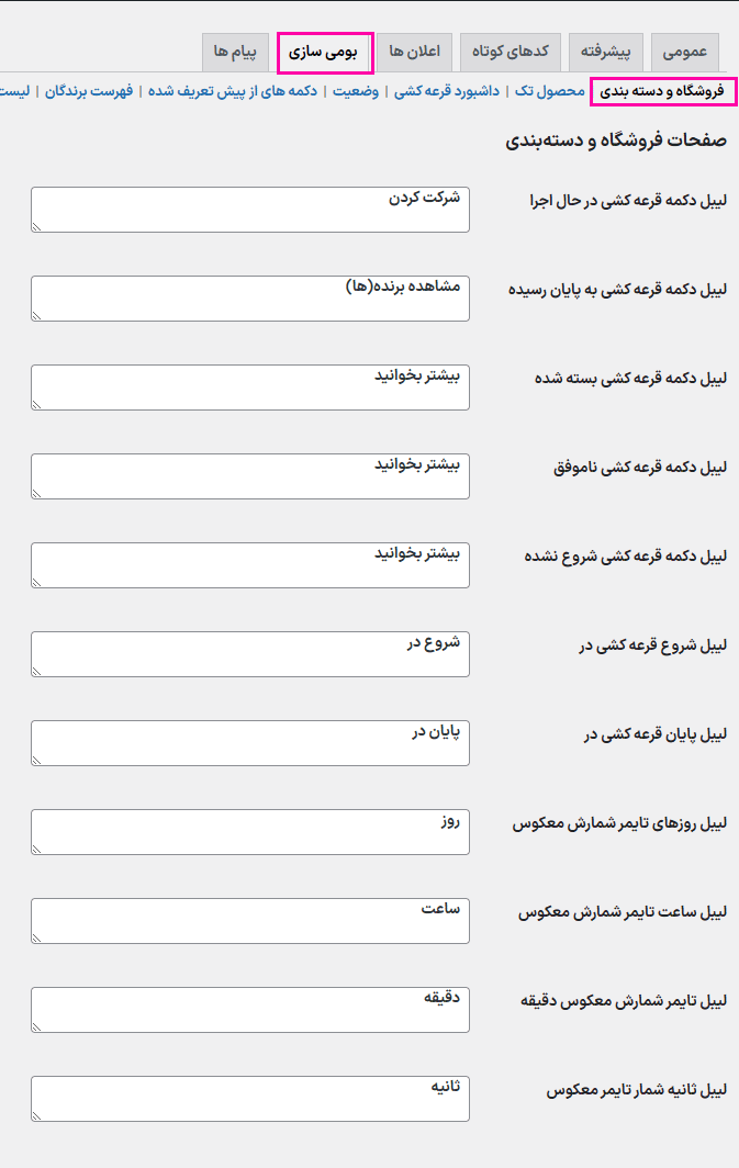 (۱) مسابقه -> تنظیمات -> عمومی -> صفحه فروشگاه -> مخفی کردن تایمر شمارش معکوس برای محصولات مسابقه در صفحات فروشگاه و دستهبندی.