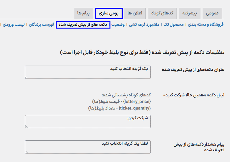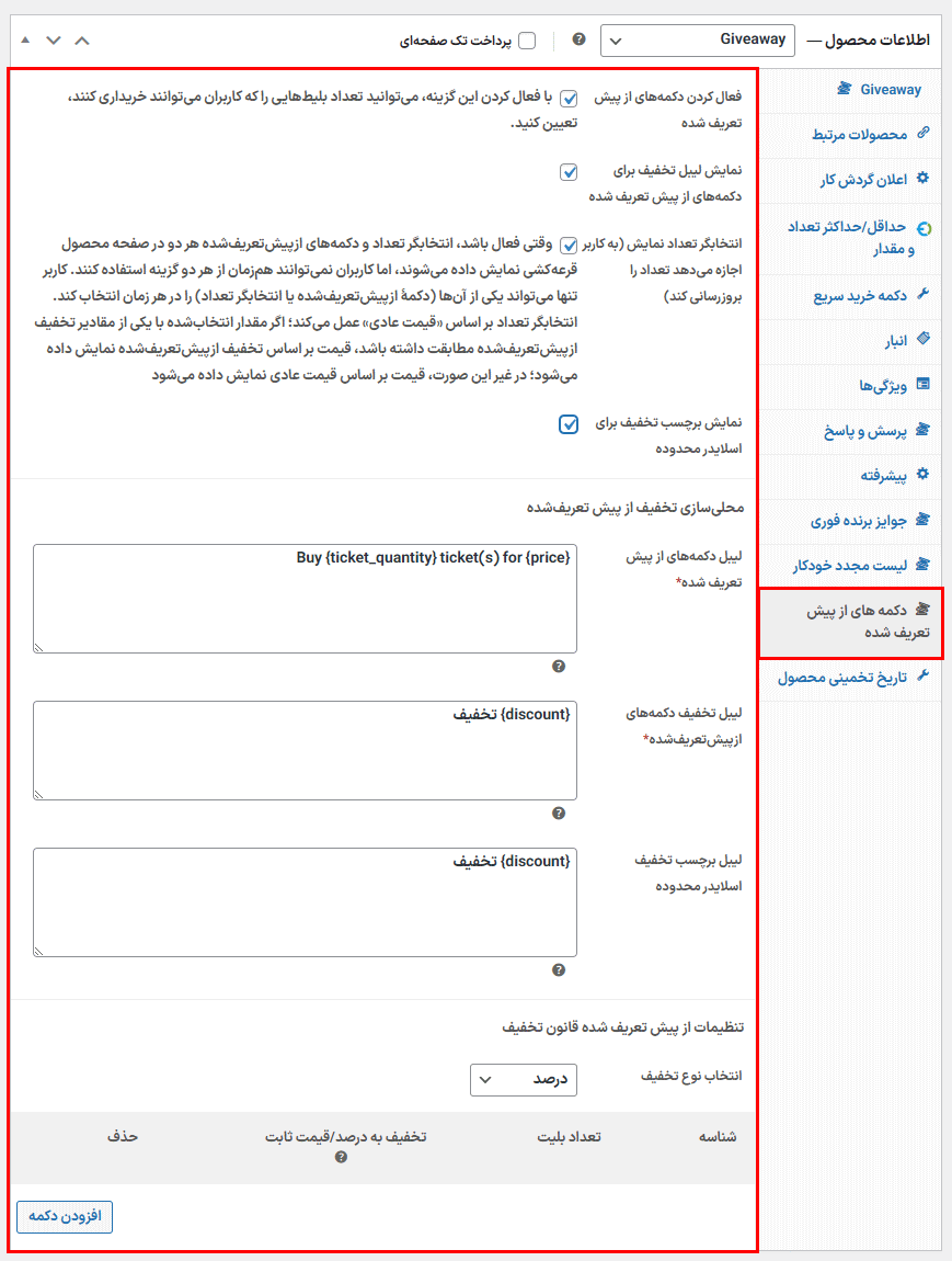 - (i) گزینه دکمههای از پیش تعریف شده برای اعمال تخفیفهای ثابت یا درصدی بر اساس تعداد بلیطهای جایزه موجود است.