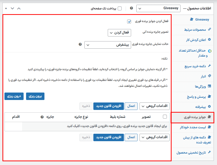 (۳) تنظیمات جوایز فوری در تنظیمات محصول Giveaway (ویرایش صفحه محصول) موجود است. - آیا گزینه ایمیل برای جوایز فوری در دسترس است؟
