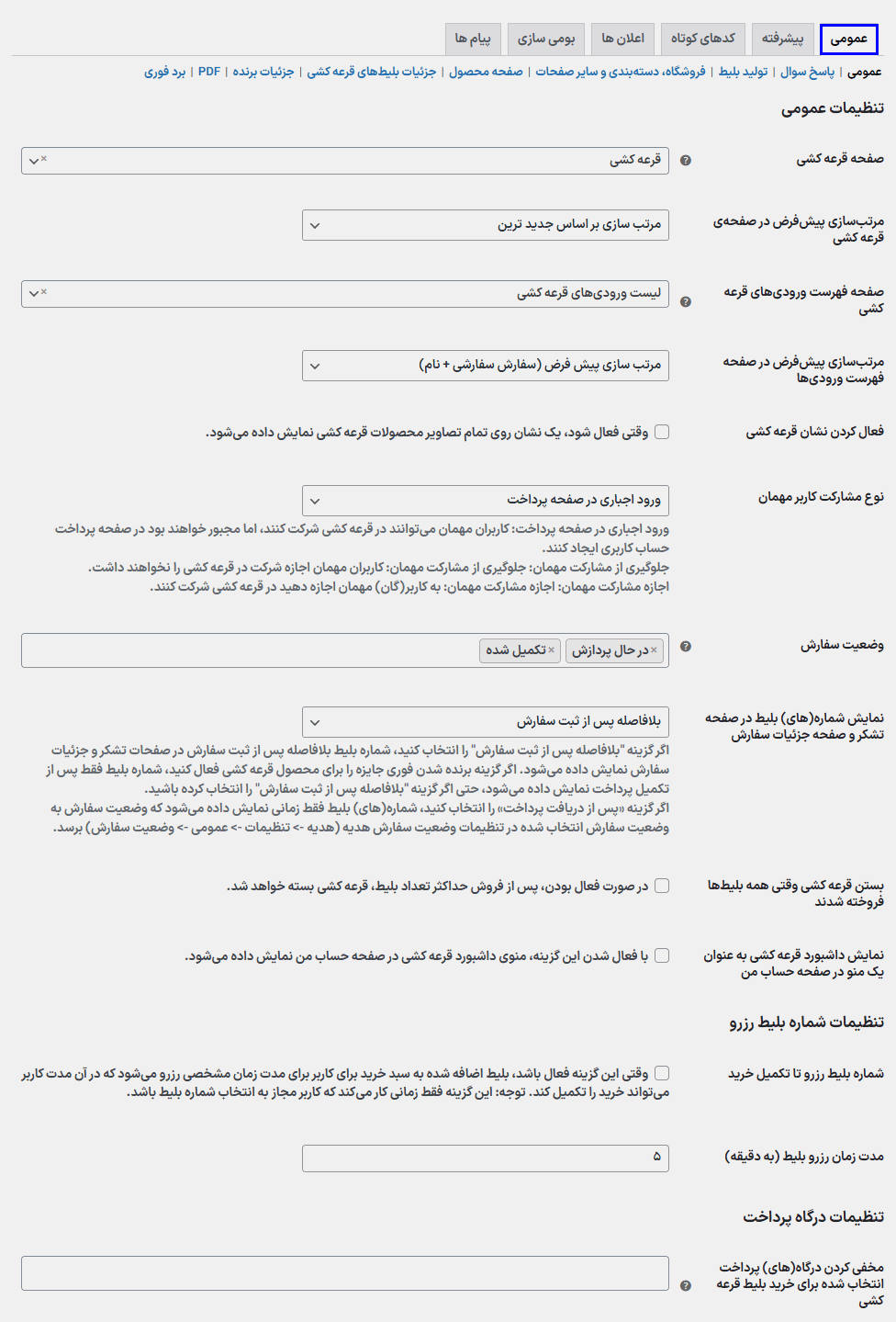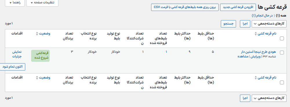 گزینه تمدید را داریم که در تنظیمات محصول قرعهکشی (صفحه ویرایش محصول) موجود است. با استفاده از گزینه تمدید، میتوانید قرعهکشی را بدون از دست دادن دادههای بلیط خریداری شده تمدید کنید. گزینه تمدید فقط برای قرعهکشی ناموفق نمایش داده میشود. - آیا میتوانیم بلیطهای قرعهکشی را برون ریزی کنیم؟