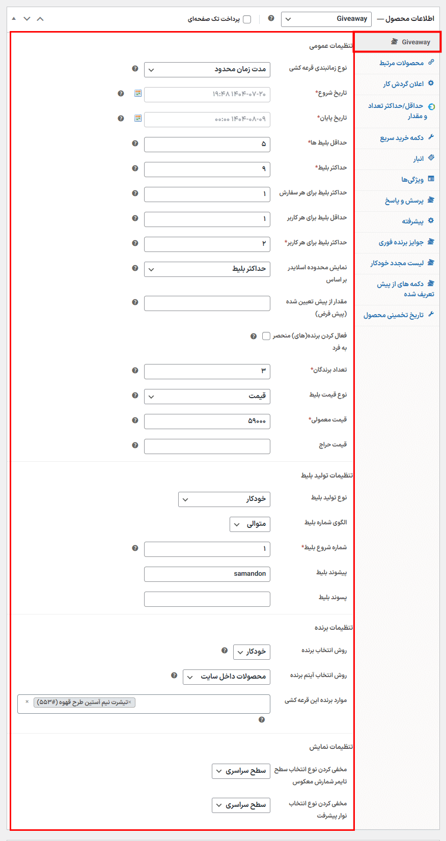 (۲) تنظیمات محصول جایزه (ویرایش صفحه محصول) -> نوار لغزندهی محدودهی نمایش بر اساس -> بلیطهای از پیش تعیینشده -> تنظیم بلیطهای از پیش تعیینشده