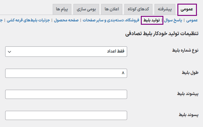 اهدا -> تنظیمات -> عمومی -> تولید بلیط -> تنظیمات تولید بلیط تصادفی خودکار -> طول بلیط -> تنظیم ۵