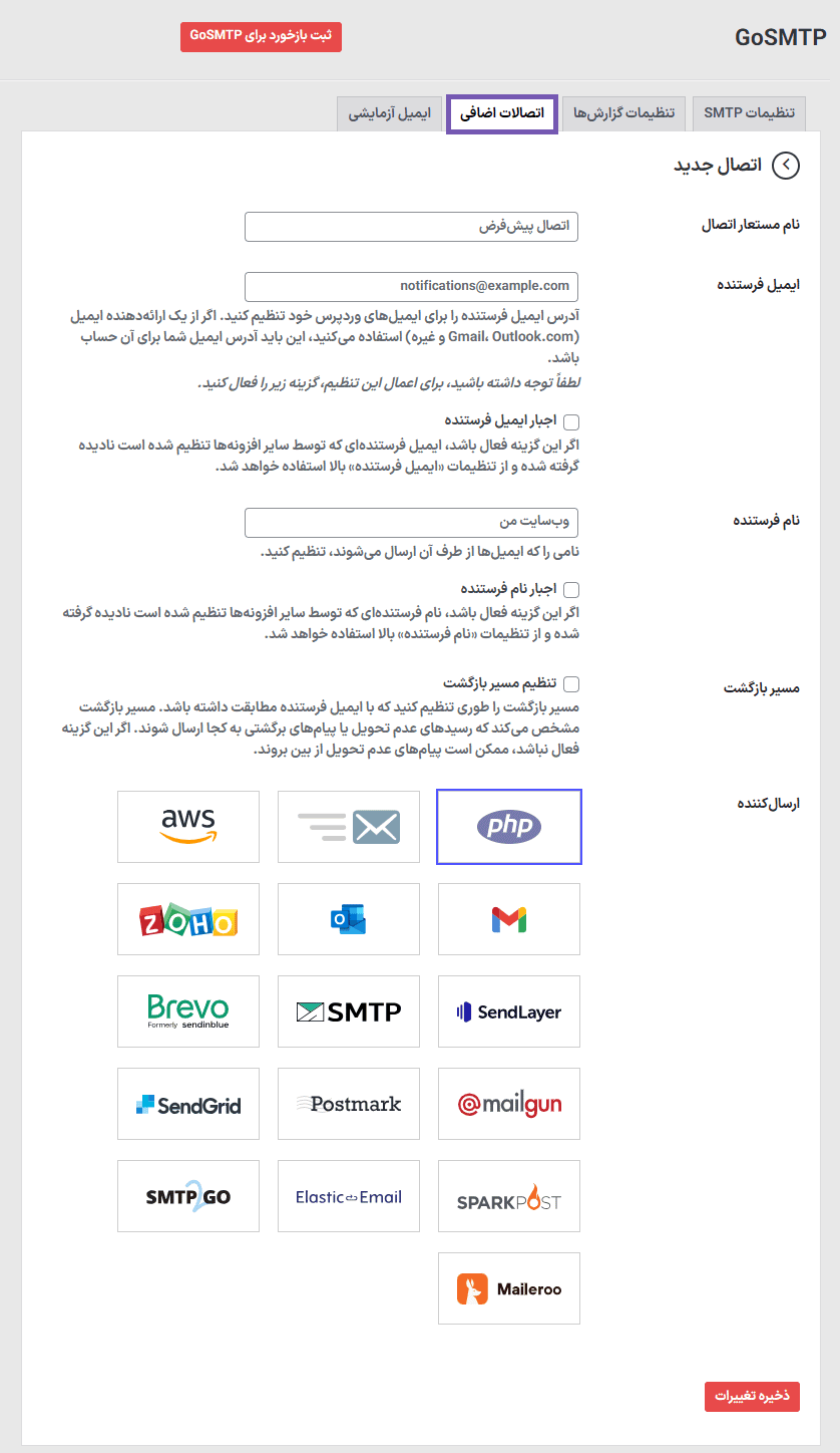 تنظیمات خروجی در افزونه GoSMTP Pro