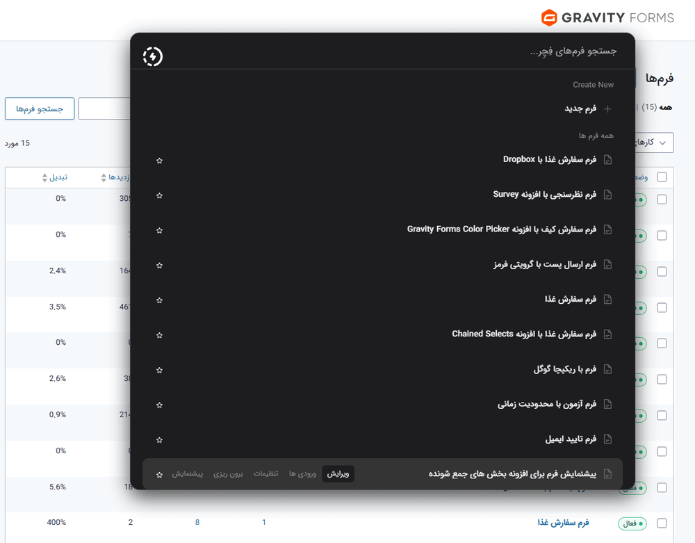 برای نمایش Gravity Forms Spotlight و یافتن سریع فرمهای مورد نظرتان، از کلیدهای Ctrl (Cmd) + Shift + F استفاده کنید. - فرمهای مورد علاقه در افزونه گرویتی فرمز فچر