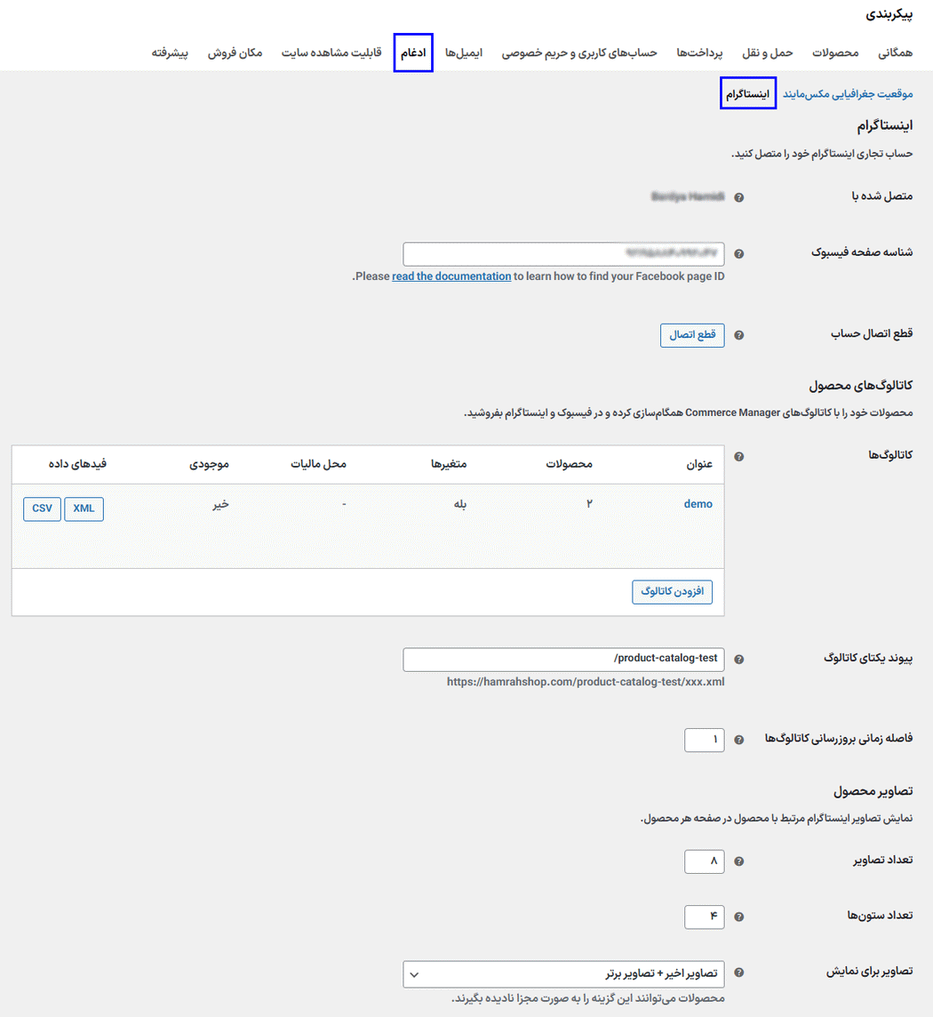 پس از اتصال حساب اینستاگرام خود به فروشگاه، تنظیمات جدیدی ظاهر میشود و میتوانید راهاندازی افزونه را شروع کنید. تنظیمات به دو بخش تقسیم میشوند: