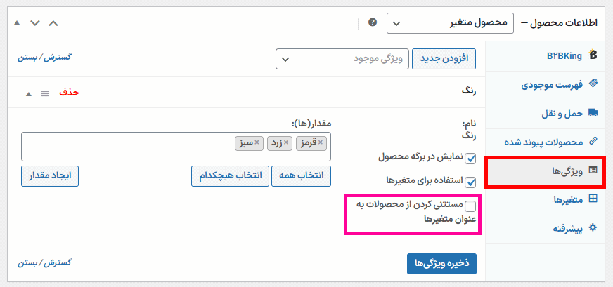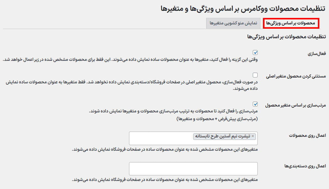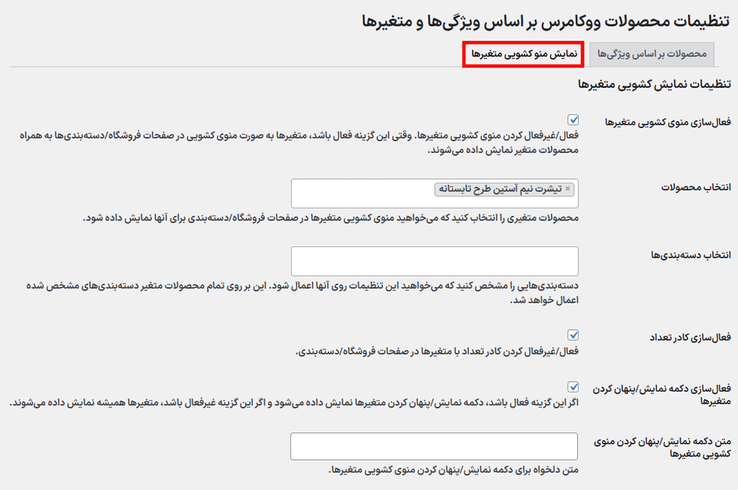 ویژگی ها در افزونه محصولات بر اساس ویژگی‌ها و متغیرها برای ووکامرس