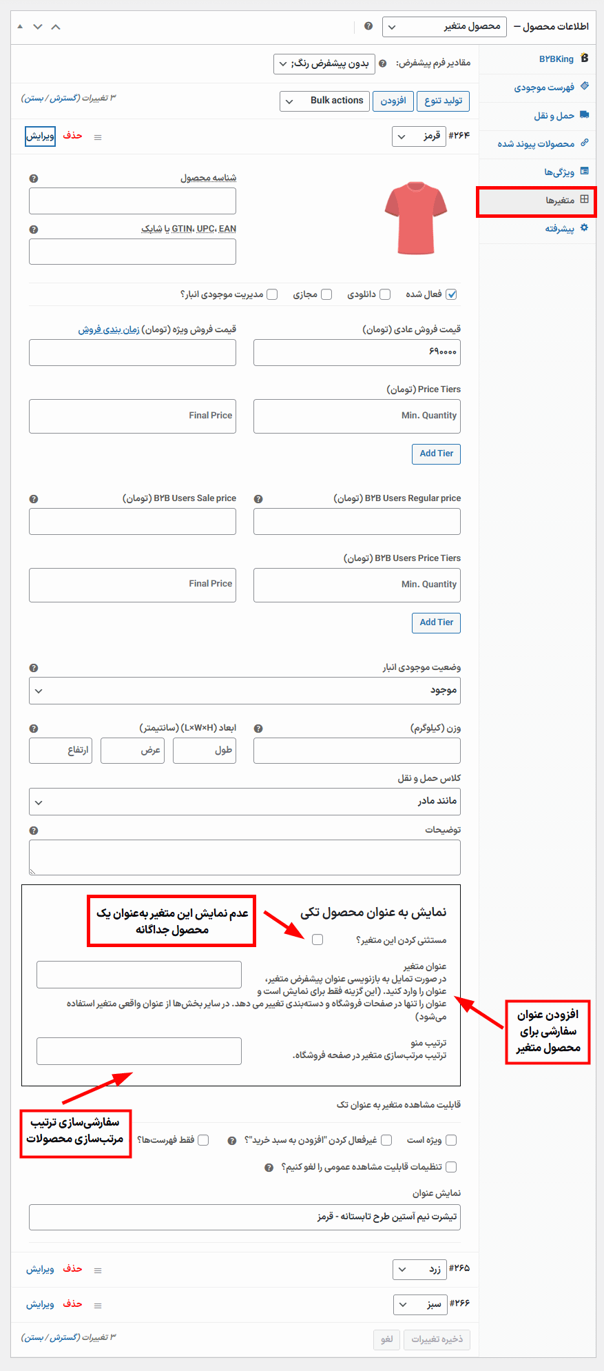 • شما می‌توانید ترتیب مرتب‌سازی پیش‌فرض منو را برای هر تنوع از صفحه ویرایش محصول > تب تنوع سفارشی کنید. لطفاً به تصویر بالا مراجعه کنید.