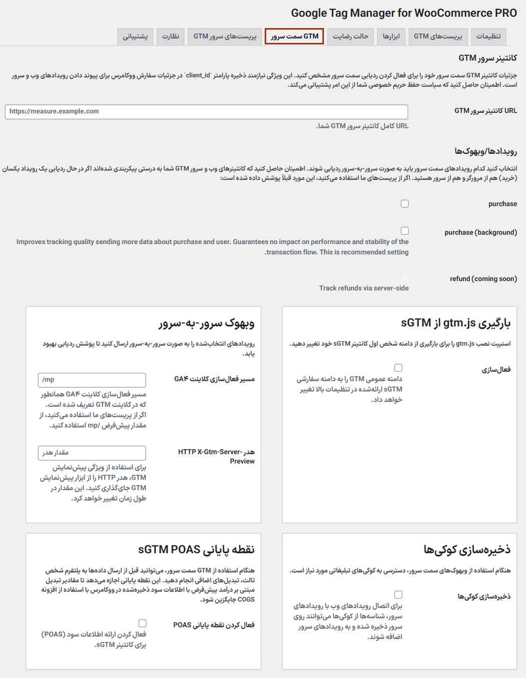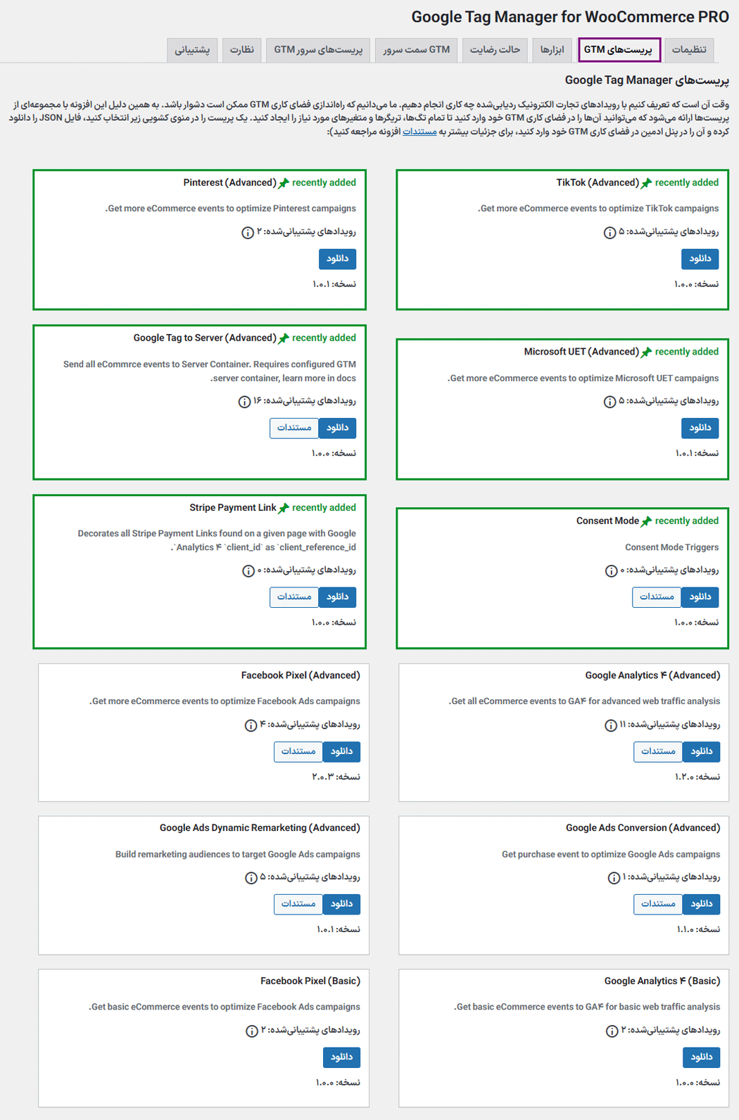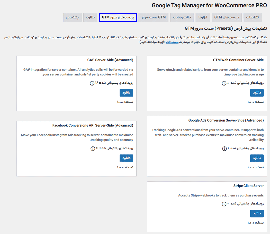 پریست های سرور GTM در افزونه تگ پایلت پرو | اتصال ووکامرس به گوگل تگ منیجر - وارد کردن پیشتنظیمات GA4