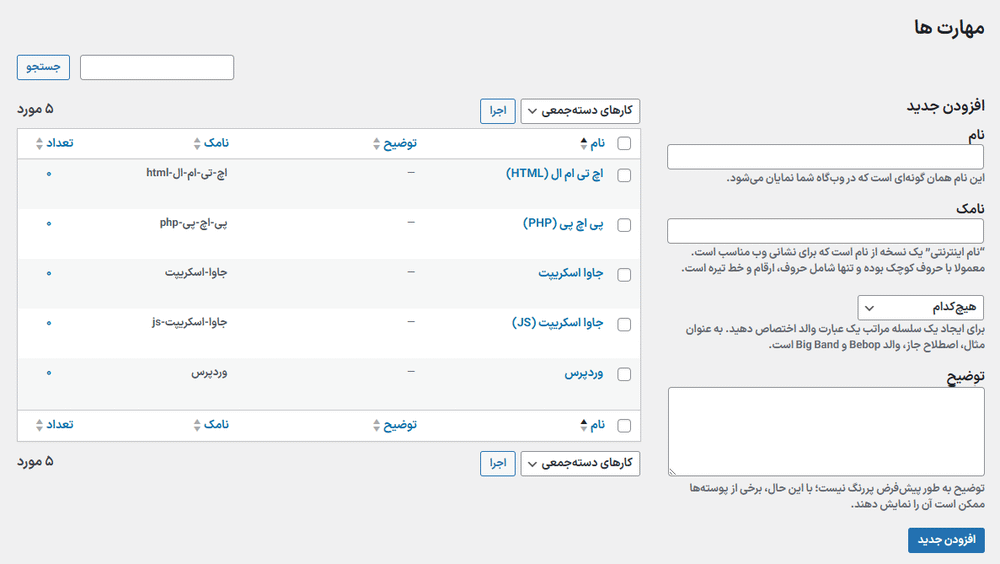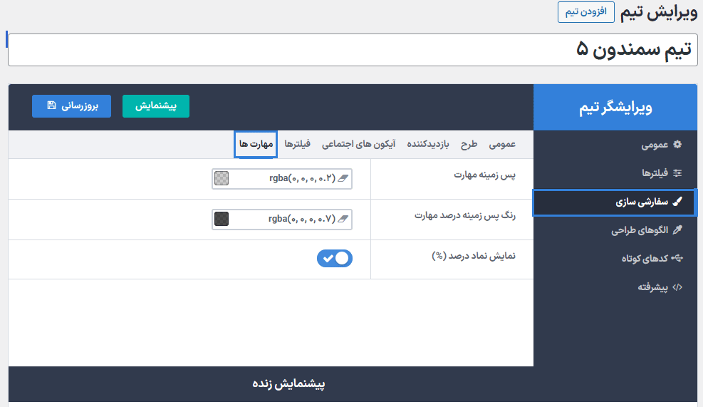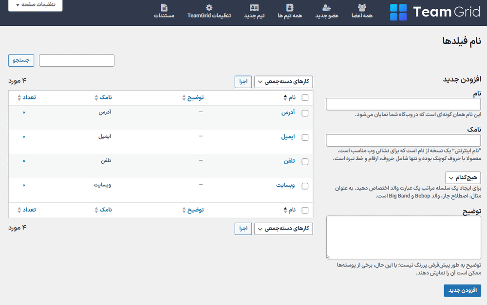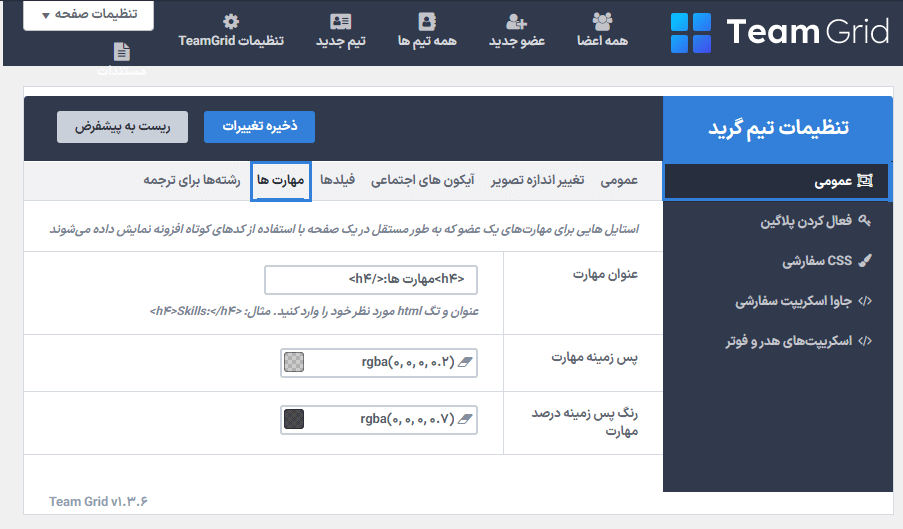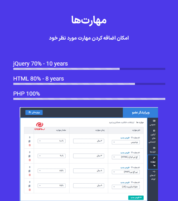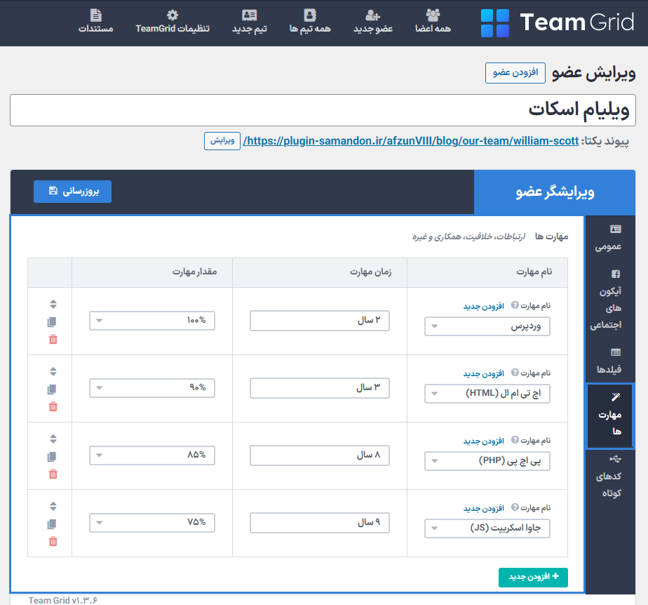 شما میتوانید فیلدهای اضافی برای هر عضو تیم مانند ایمیل، تلفن، آدرس اضافه کنید. - مهارتهای اعضا
