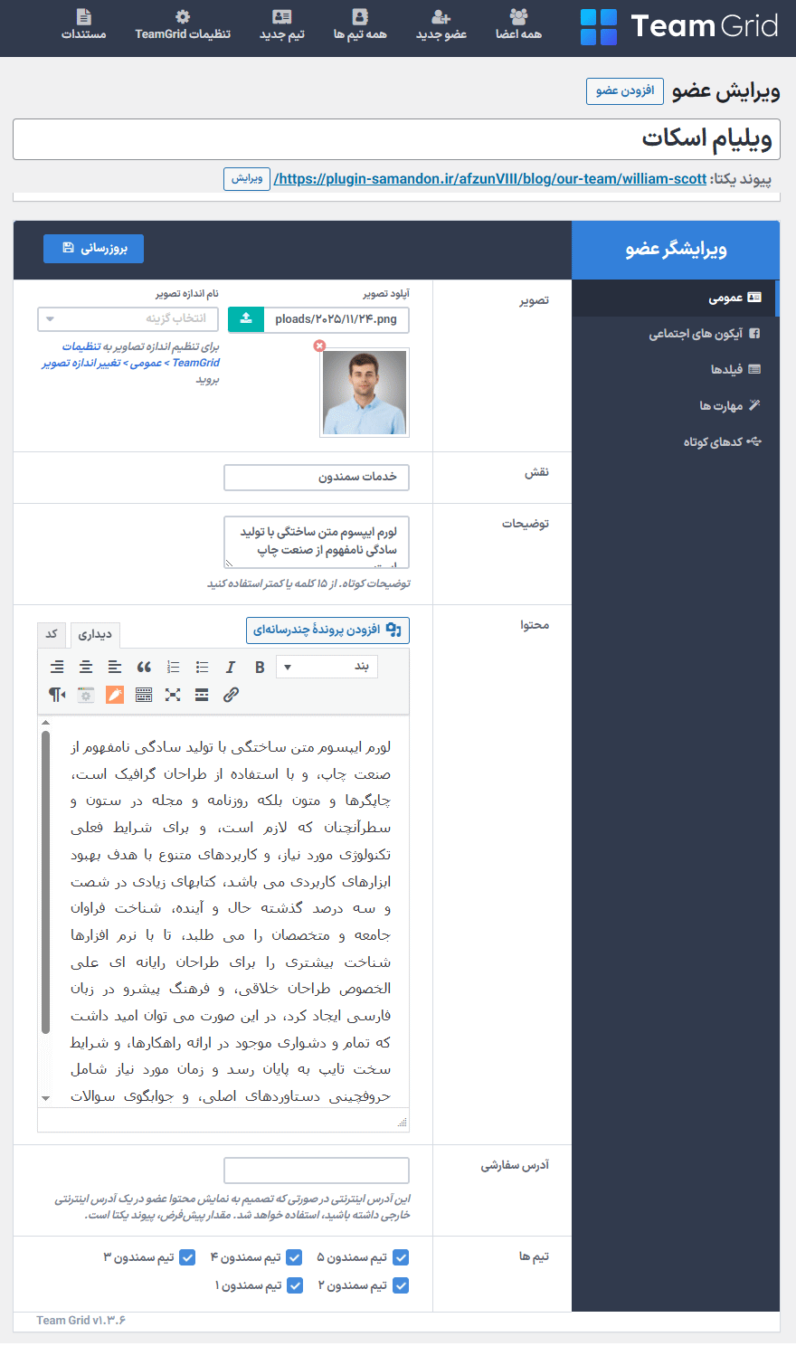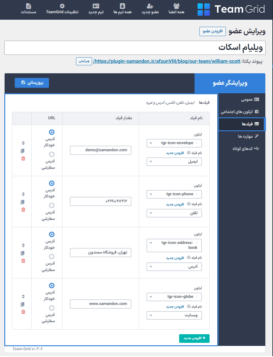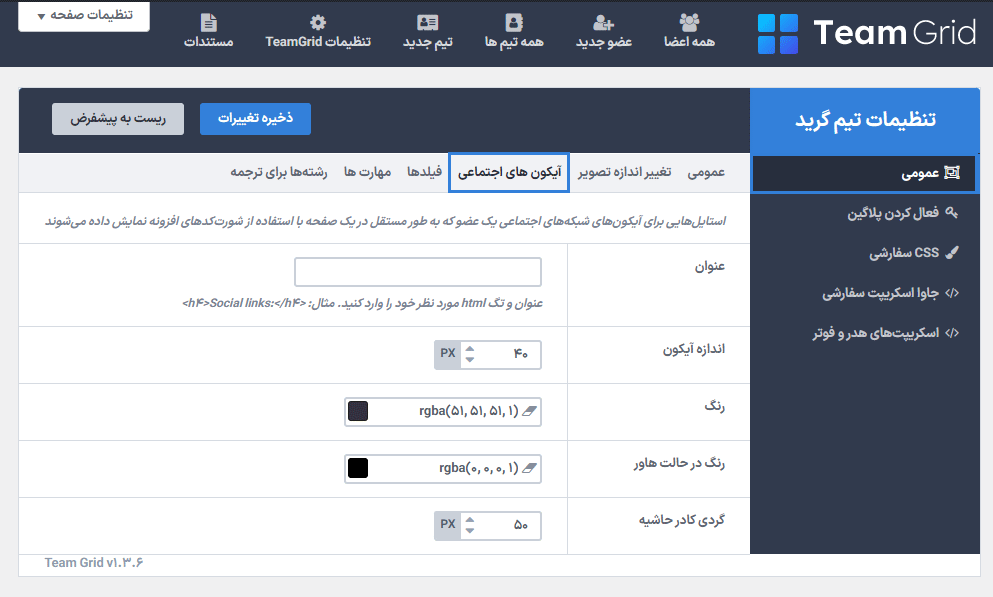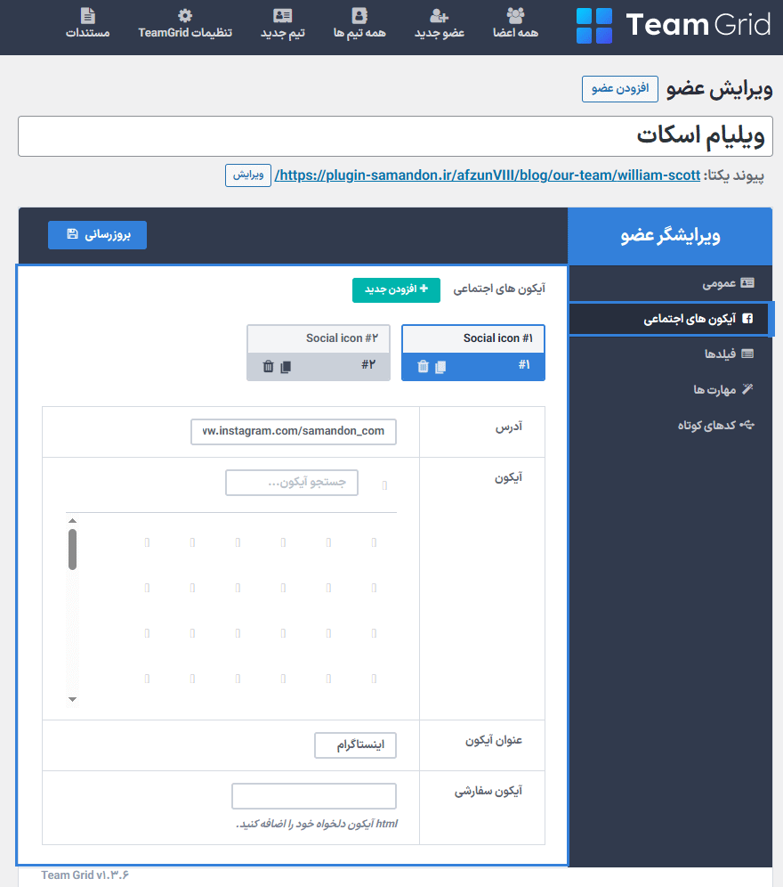 - افزونه تیم گرید | نمایش ویترین اعضای تیم برای وردپرس دارای آیکونهای شبکههای اجتماعی اعضا. (فیسبوک، توییتر، لینکدین و غیره)