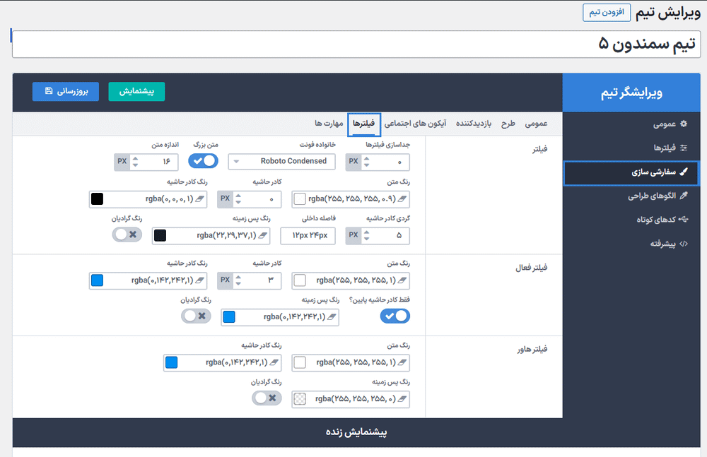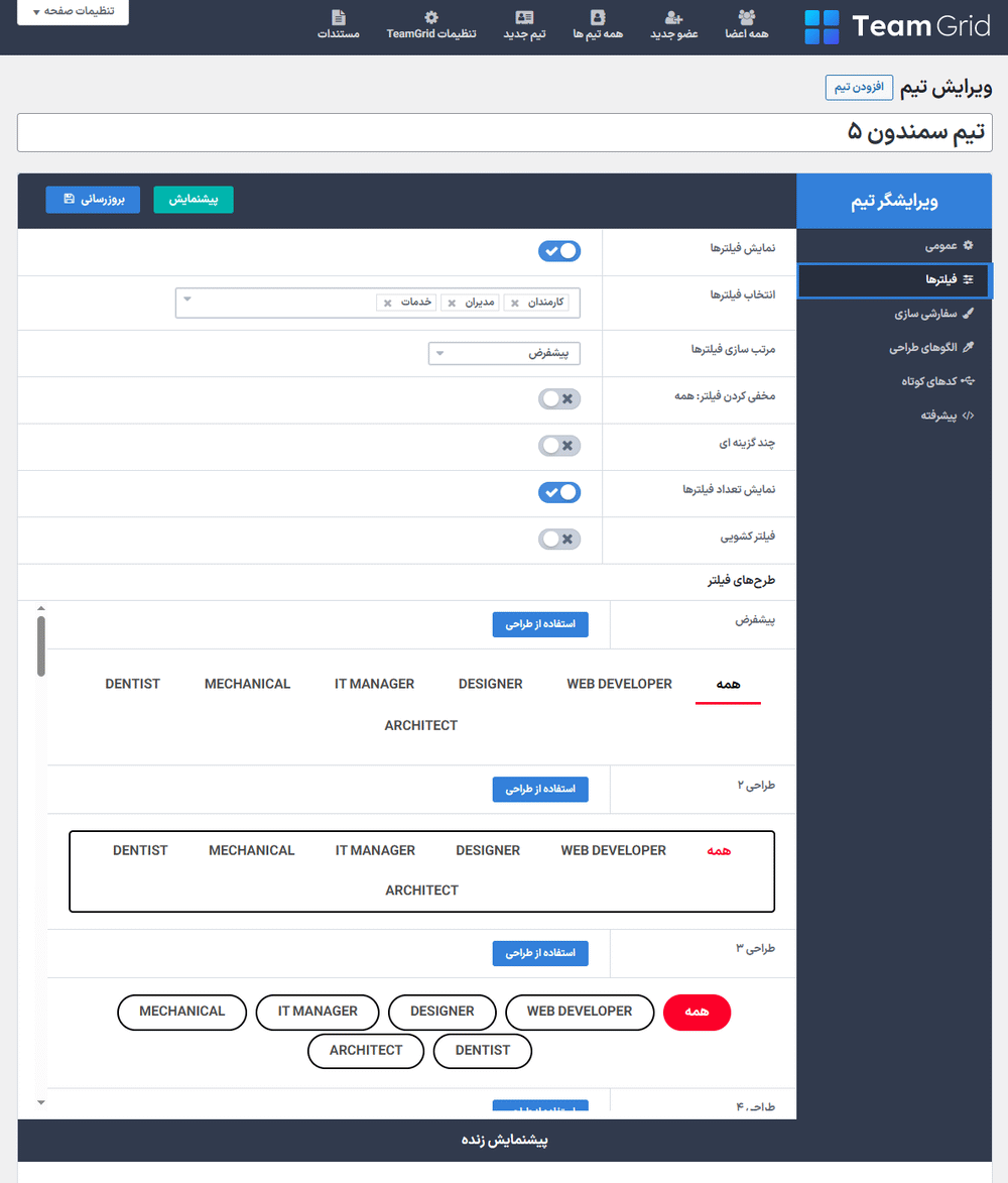 - افزونه Team Grid – Team Member Showcase WordPress Plugin & Team Editor دارای فیلترهای تیم. +20 سبک فیلتر از پیش تعریف شده.