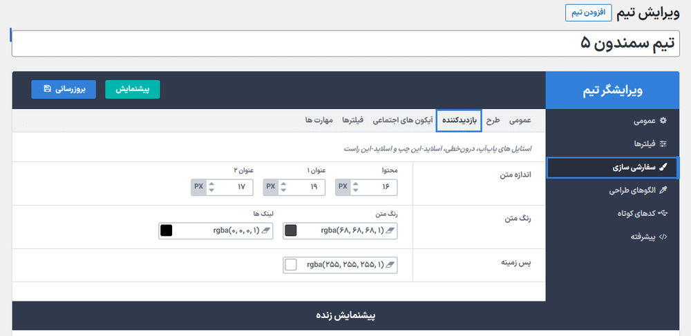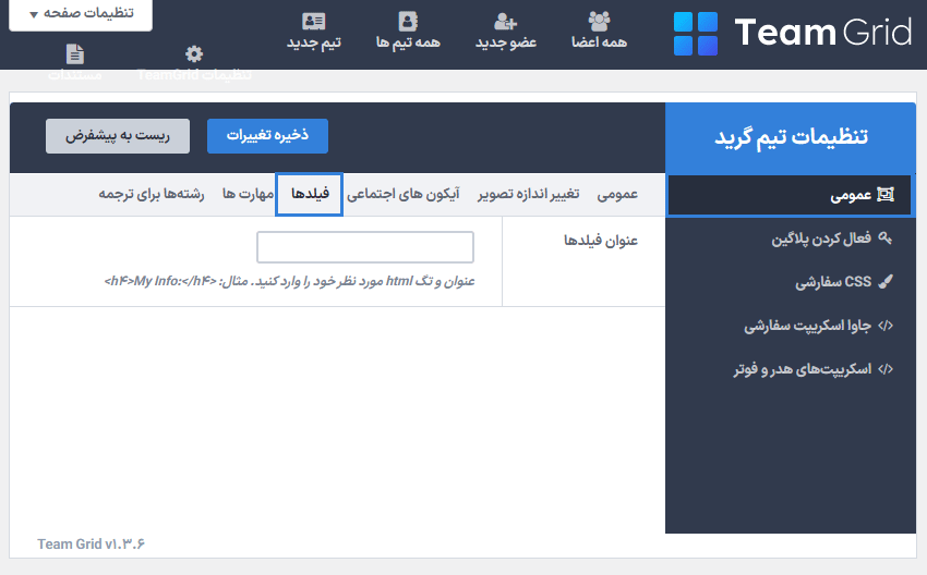امکان اضافه کردن شبکههای اجتماعی هر یک از اعضای تیم (فیسبوک، توییتر، لینکدین و غیره) وجود دارد. - فیلدهای اعضا در افزونه تیم گرید | نمایش ویترین اعضای تیم برای وردپرس