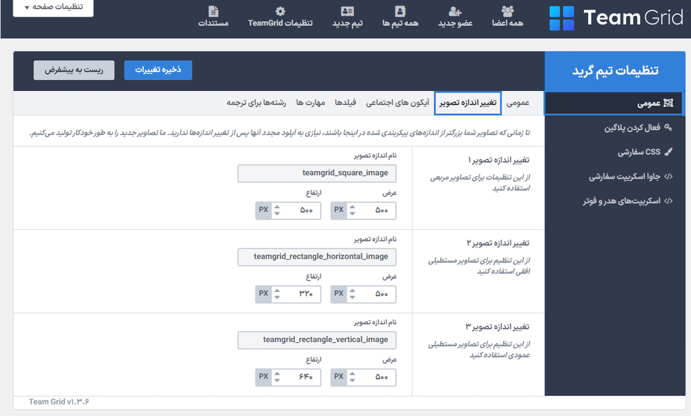 - افزونه Team Grid – Team Member Showcase WordPress Plugin & Team Editor دارای اندازههای مختلف تصویر (تصاویر مربعی، تصاویر عمودی و تصاویر افقی).