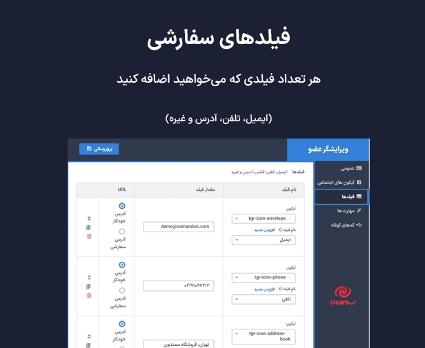 - دارای فیلدهای اعضا (ایمیل، تلفن، آدرس و غیره).
