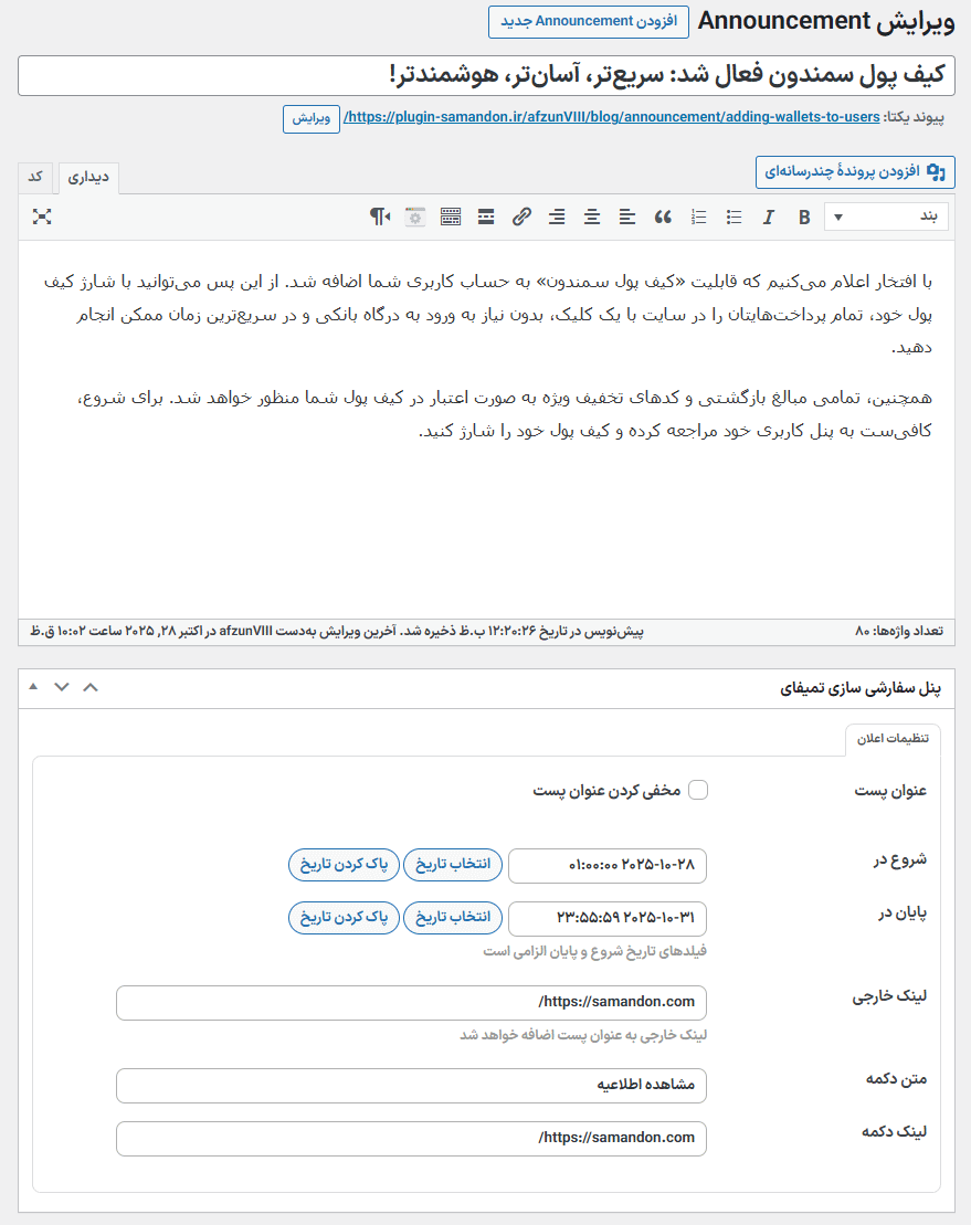 - شروع از = این گزینه تاریخ/زمان شروع نمایش پست اعلان در نوار اعلان سایت را تعیین میکند.