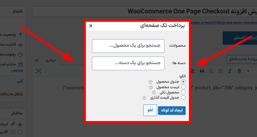 برای درج کد کوتاه پرداخت تک صفحه‌ای با استفاده از رابط گرافیکی:
