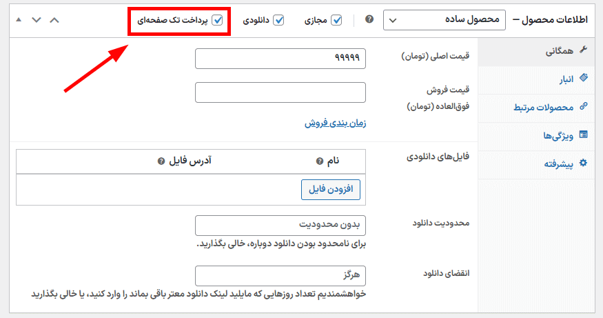 • پس از فعال شدن پرداخت تک صفحه‌ای، گزینه جدیدی به پنل داده‌های محصول اضافه می‌شود. با علامت زدن این گزینه، پرداخت تک صفحه‌ای برای آن محصول خاص فعال می‌شود.