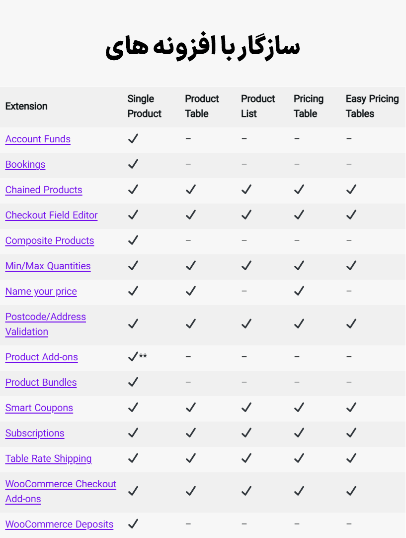 پرداخت تک‌صفحه‌ای می‌تواند با بیش از دوازده افزونه ادغام شود و به شما امکان می‌دهد اشتراک‌ها، رزروها، بسته‌ها و بسیاری از انواع محصولات منحصر به فرد دیگر را بفروشید.