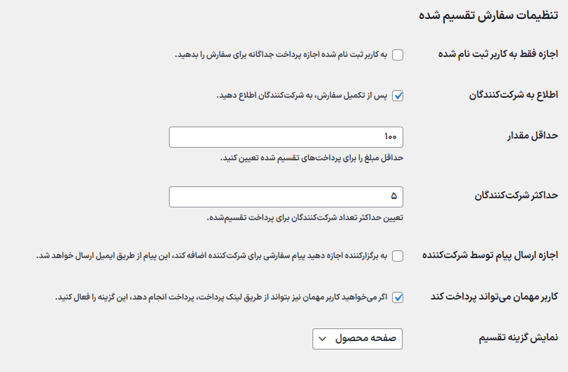 - پرداخت تقسیمی ووکامرس گزینهای برای پیکربندی حداکثر شرکتکنندگان برای پرداخت تقسیمی دارد.