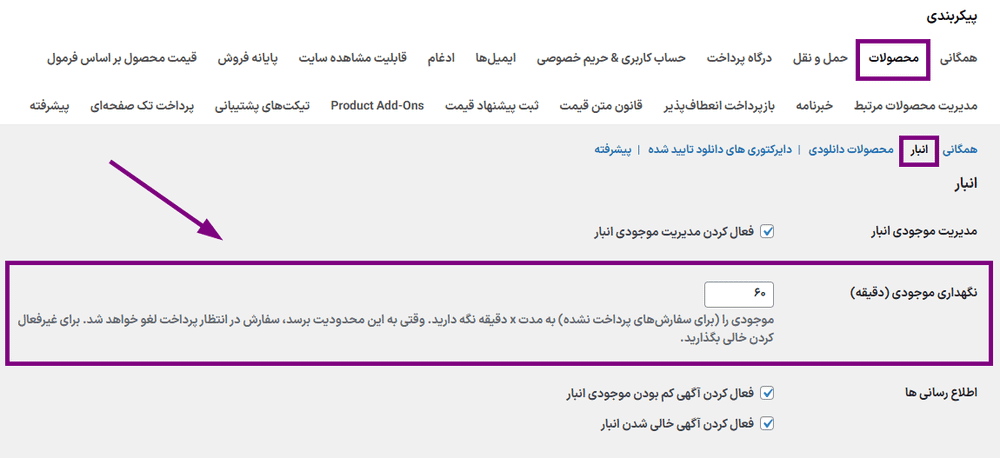 در ووکامرس تنظیماتی برای محدودیت زمانی موجودی (سفارشهای پرداخت نشده) وجود دارد. وقتی به این محدودیت برسد، سفارش در انتظار به طور خودکار لغو میشود.