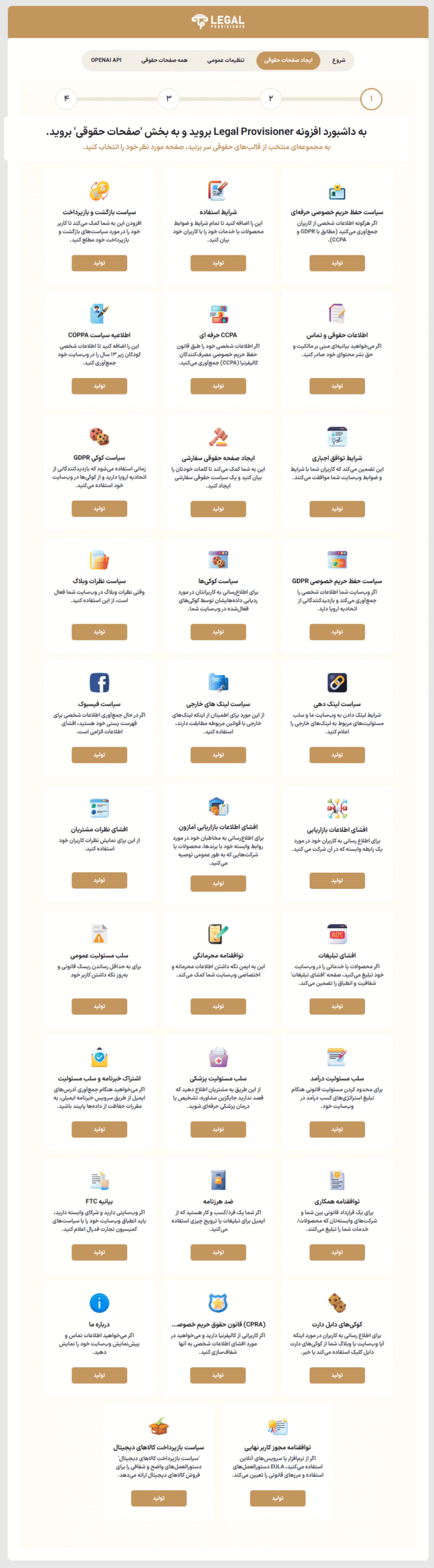 - قابلیت تولید خودکار صفحات شرایط خدمات و تمام خدمات حقوقی
