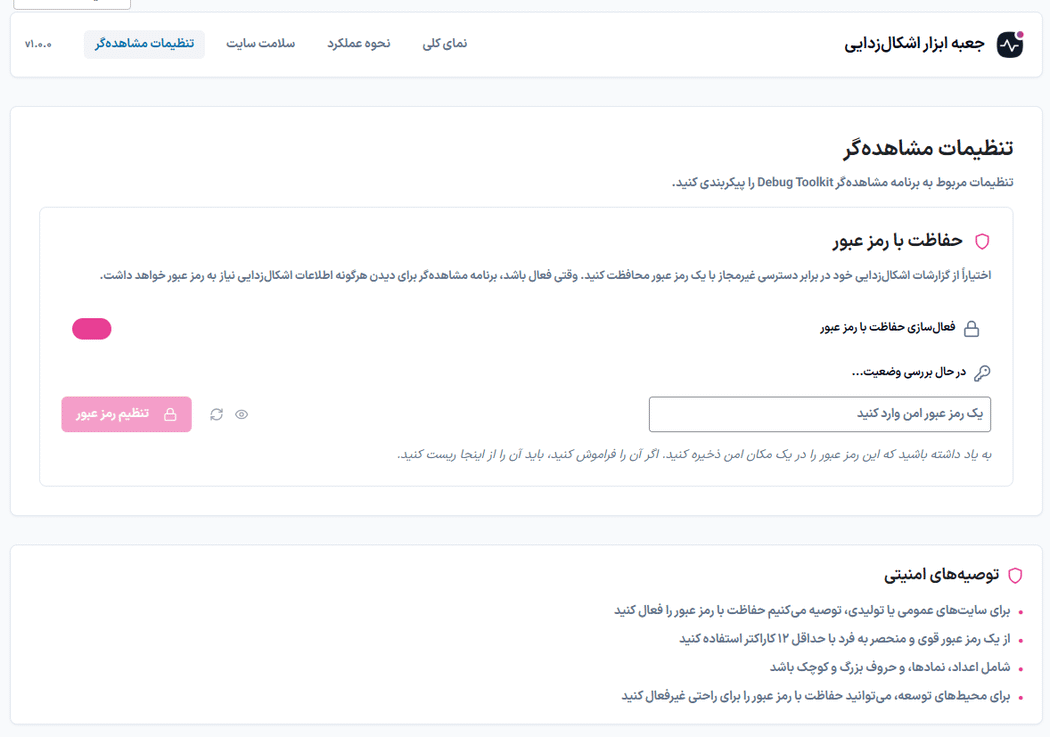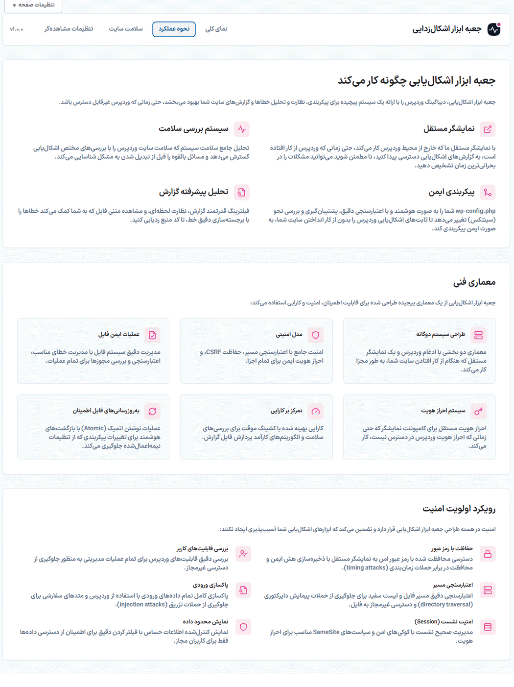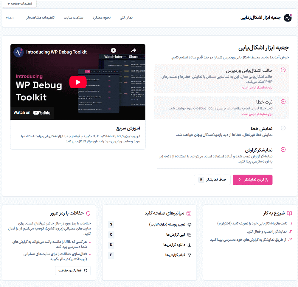 افزونه WP Debug Toolkit Pro دارای ویژگی پنهان سازی خطاها از دید بازدیدکنندگان با قابلیت غیرفعال کردن نمایش خطا است. این افزونه دارای نمایشگر پیشرفته برای مشاهده خطاهای سایت و ارائه گزارش دقیق از رخدادها است و امکان حفاظت با رمز عبور برای ایمنسازی گزارشهای اشکالزدایی را فراهم میکند. مدیریت نشست با کوکیهای امن و سیاستهای SameSite مناسب برای احراز هویت تضمین میشود. همچنین تمامی دادههای ورودی بهصورت کامل پاکسازی میشوند تا از حملات تزریق جلوگیری شود. حالت اشکالزدایی فعال، ثبت خطا و کنترل نمایش خطاها از دیگر قابلیتهای کلیدی افزونه هستند که تجربهای حرفهای و ایمن برای توسعهدهندگان و مدیران سایت فراهم میکند. این افزونه تجربهای امن و کارآمد در شناسایی و رفع خطاها ارائه میدهد.