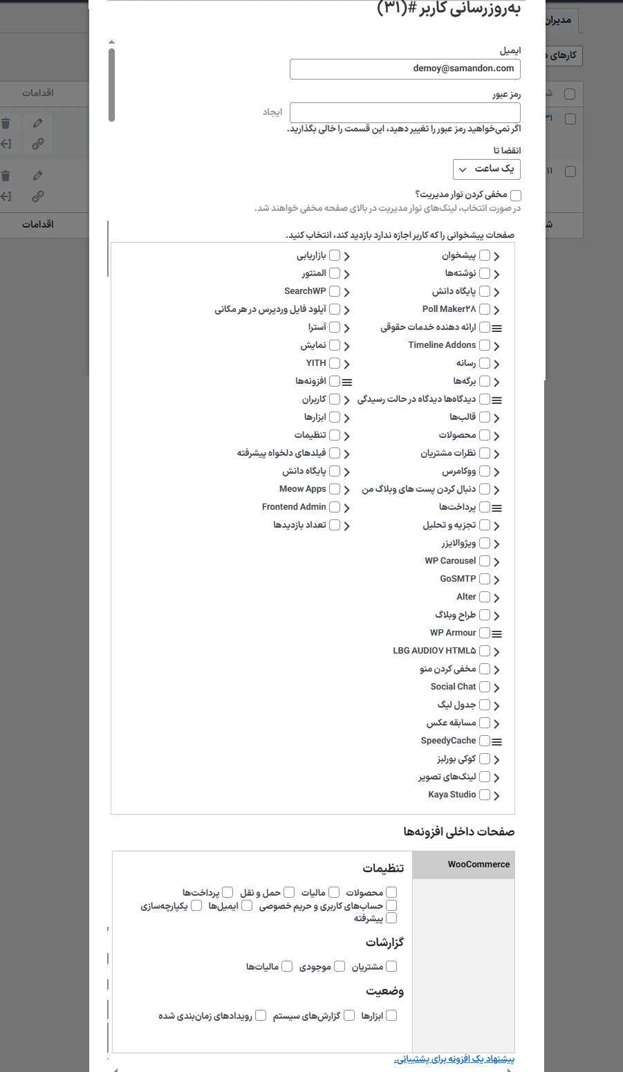 به تنظیمات بروید، تاریخ را تنظیم کنید، و حساب به طور خودکار منقضی میشود. - آیا میتوانم تنظیمات خاصی از افزونه را محدود کنم؟ بله، میتوانید تنظیمات افزونه مانند تبهای ووکامرس را محدود کنید.