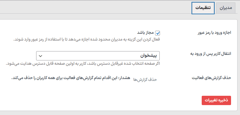 هنگام ارسال دسترسی به کاربر، راحتی بیشتری اضافه کنید، میتوانید یک URL ورود امن برای کاربر ایجاد کنید و کاربر بدون نیاز به رمز عبور از لینک برای ورود به داشبورد استفاده میکند. همچنین میتوانید ورود با رمز عبور را برای مدیران محدود غیرفعال کنید، این کار مدیر را از ورود با استفاده از رمز عبور یا ارسال ایمیل تنظیم مجدد رمز عبور محدود میکند. - گزارش فعالیت